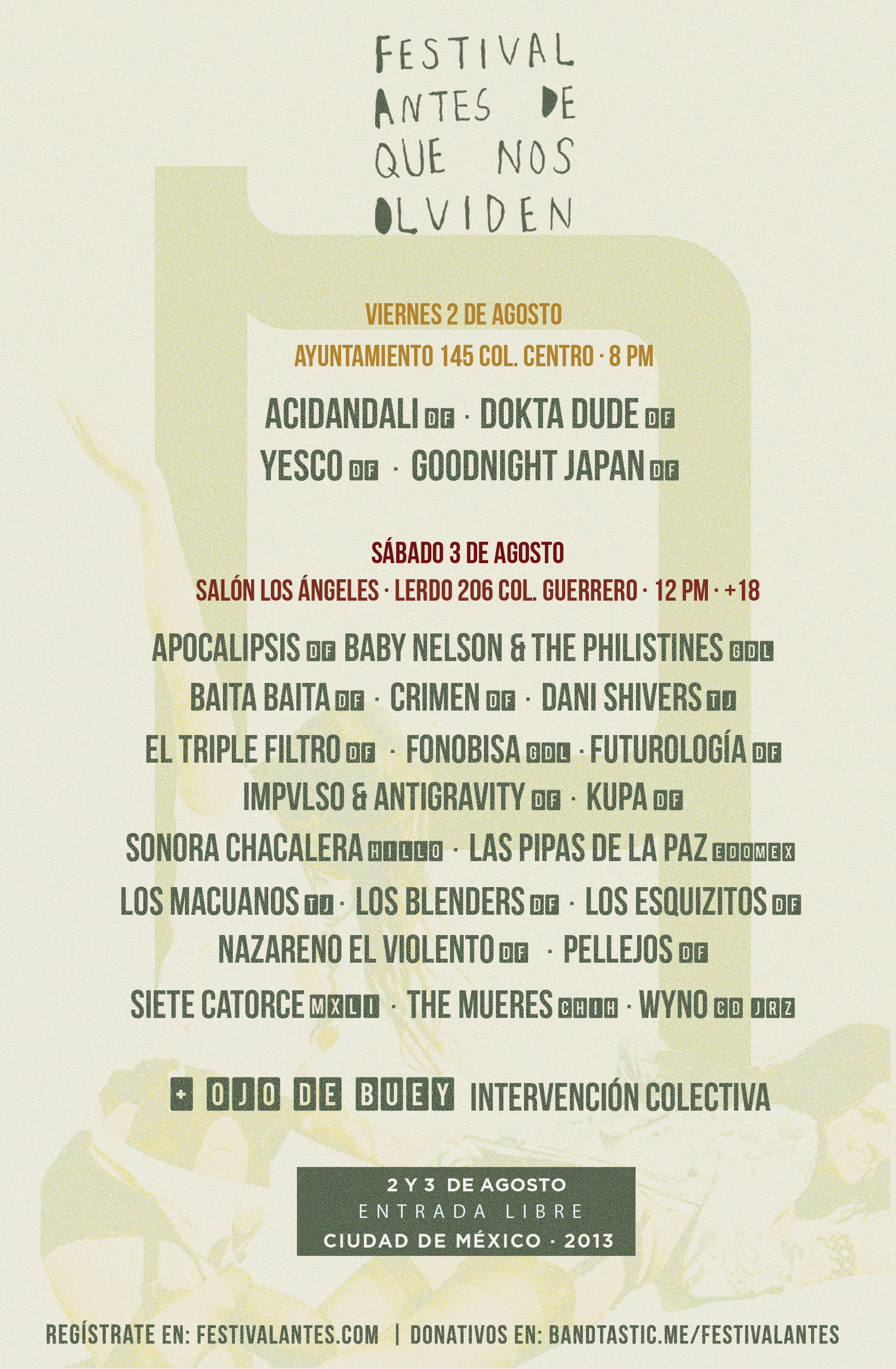 Un nuevo espacio abre sus puertas para recibir parte de los showcases del Festival: Afterpop inició el domingo, el miércoles continuará con el El Historial, el jueves con Volta y el viernes con la Noche Antes, 1a parte del Festival Antes, acompañados de Ediciones Acapulco. Todas las actividades anteriores son gratuitas, para todas las edades y tienen line-ups plagados de talento en todos los géneros.