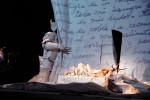 Con un Judas de tres metros que sorprende al iniciar su movimiento en escena, y una escenografía llena de papel en la que se proyectan las cartas originales de Frida, se nos muestran aspectos poco conocidos de la pintora que nos envuelven en una atmósfera de contrastes.