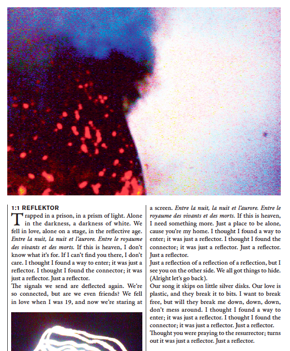 Al principio del video, las sombrías letras de la canción parecen la plegaria del desamparado: “Trapped in a prism/ In a prism of light/ Alone in the darkness/ Darkness of white”. Como complemento, en el video Win Butler, el vocalista, y su esposa Régine Chassagne manejan sin rumbo un viejo camión militar. Sin embargo, con el coro (“I thought I found a way to enter/ It’s just a Reflektor (It’s just a Reflektor)/ I thought I found the connector/ It’s just a Reflektor (It’s just a Reflektor)”) y, después, con la sugerente escena de todo el grupo reverenciando una bola disco suspendida del cielo, al parecer las preguntas son respondidas. Entonces, como en las caniculares tierras de Haití, se palpa presente a lo divino: al final sólo un reflejo repetido.