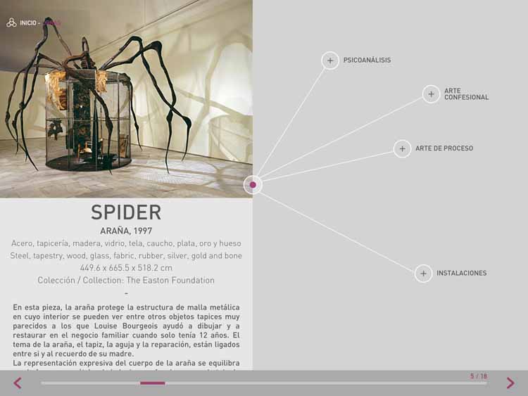 La aplicación para Ipad es una aplicación multisensorial para observar la trayectoria artística de Louise Bourgeois, la cual se relaciona con algunos de los principales movimientos artísticos del siglo XX: surrealismo, expresionismo abstracto y pos minimalismo, además de contar con influencias de Jackson Pollock, Marcel Duchamp y Max Ernst.