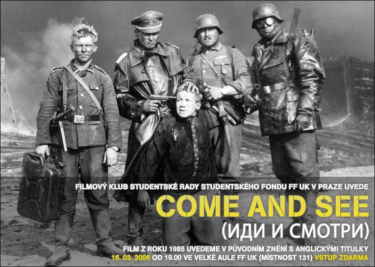 Ven y mira, film que representa los hechos ocurridos en una de las 658 aldeas de Bielorrusia que fueron quemadas junto con sus habitantes por el ejército nazi. El año 1943, la ocupación nazi dejó miles de muertos. La película conmemora el 40° aniversario de la victoria aliada; sin embargo no es posible celebrar la batalla: muerte, destrucción, violación, los horrores de los campos de concentración. La película enfoca la expresión muda de miedo, dolor y furia mezclados y representados excelsamente por el actor Alekséi Krávchenko: Fliora, por medio del cual podemos ver la transformación por la rudeza del ejército, por la destrucción de su campamento, por la muerte de su madre y hermanas las cuales las encuentra en una pila de carne en donde el sonido de moscas impera.