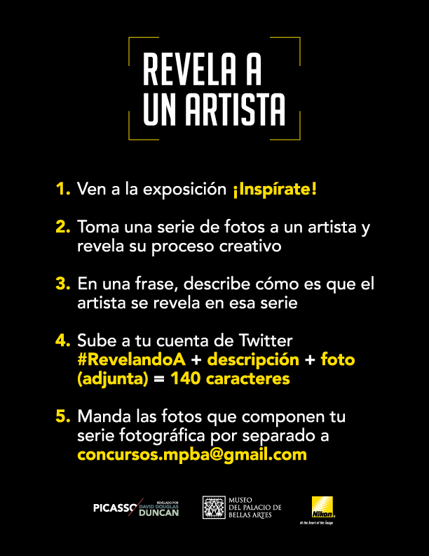 El Museo del Palacio de Bellas Artes y Nikon México te invitan al concurso de fotografía “Revela a un artista” con el objetivo de difundir el talento mexicano a través de imágenes que retraten el proceso creativo e íntimo de algún artista plástico. Los participantes deberán presentar su trabajo inspirado en la relación artística que se logra apreciar, a lo largo de la sala Nacional del recinto, entre el fotoperiodista David Douglas Duncan y el pintor Pablo Picasso.