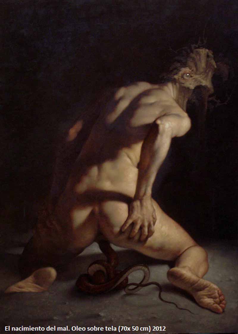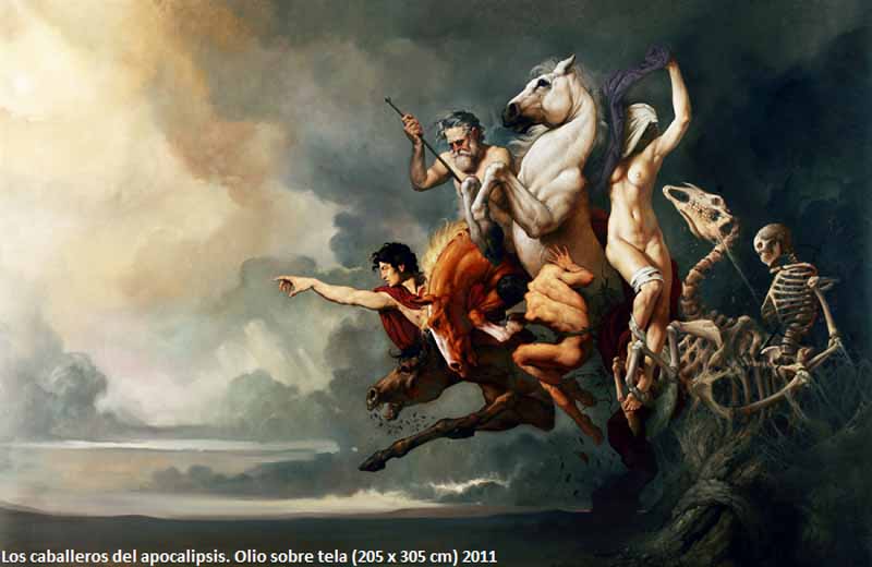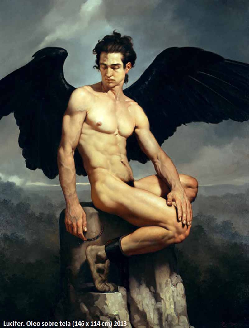 El motivo de sus cuadros es la mitología clásica y católica. Encontramos dioses y héroes en actitudes que pocas veces nos hubiésemos imaginado. Demonios, náyades, nereidas, esfinges; Lucifer encadenado, Gea voluptuosa en espera de sus hijos, Amor expectante ante la tumba de Psique; Santa Rosalía en éxtasis, San Sebastián imbuido por saetas vivas, Saulo sumido en la oscuridad. El nacimiento del mal es tal y como nuestro corazón lo imaginaría; la unión del cielo y la tierra es destrucción; y de las raíces de la tierra surgen los jinetes del apocalipsis. Todos están captados en sus acciones distintivas, pero la postura de éstos dista a lo convencional: se muestran de espaldas, expresan gozo en sus heridas, sufren con placer su transformación a lo etéreo.