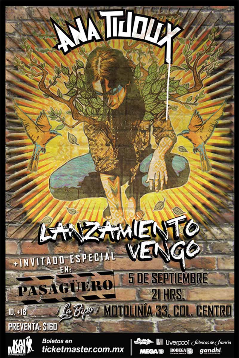 Después de presentarse en el Vive Latino 2014, Ana Tijoux llegará el próximo 5 de septiembre al Pasagüero del de la Ciudad de México para interpretar “Vengo”, su más reciente producción. El álbum está conformado de 17 canciones grabadas en Estudios Celis y producido por Andrés Celis (productor de su álbum La Bala) en Santiago de Chile.