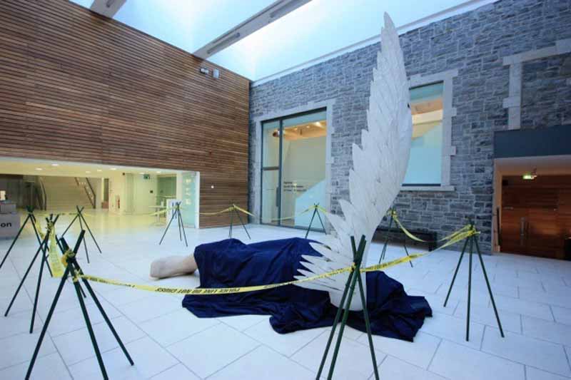 También podremos ver la famosa obra de El ángel caido. La pieza muestra la silueta plana de lo que podría ser un cuerpo donde lo único que se yergue son las alas blancas del ángel. Nuevamente nos muestra que incluso en su caída, el cuerpo del ángel es de distinta materia a la nuestra, y por ello, el tener contacto con él es imposible. Recuerda un poco el mito de Satanás, ángel caído por antonomasia, pero también nos invade un sentimiento de tristeza al saber que incluso un ser inmortal es susceptible a la desaparición.