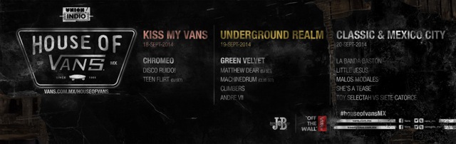 La segunda edición de HOUSE OF VANS MÉXICO se realizará del 18 al 20 de septiembre en el Distrito Federal; durante los tres conciertos programados veremos a Chromeo, Green Velvet, Matthew Dear DJ Set, Disco Ruido!, Toy Selectah, Little Jesus y muchos artistas más. Para obtener entradas a los tres eventos de HOV, deberás registrarte aquí durante las siguientes fechas y horarios: