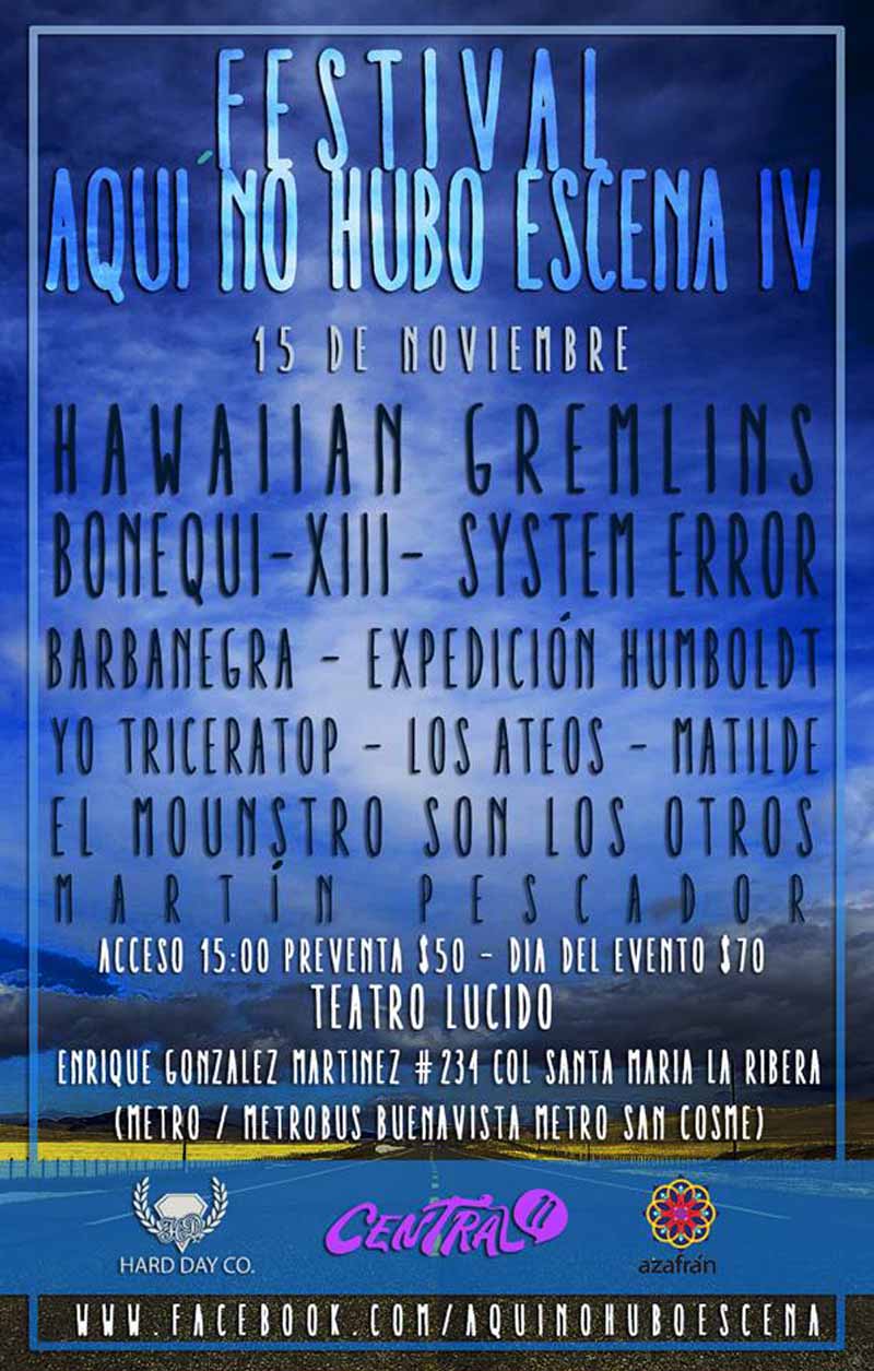 La cuarta edición del Festival Aquí No Hubo Escena (ANHE) nos traerá nuevamente un cartel lleno de bandas emergentes de la escena nacional, entre ellas Hawaiian Gremlins, System Error y Expedición Humbolt. En esta ocasión la sede será el Teatro Lúcido ubicado en Enrique González Martínez no. 234, colonia Sta. María la Ribera, Ciudad de México.