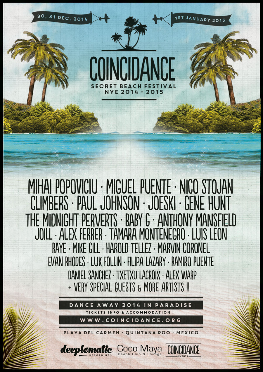 Organizado por Deeplomatic Recordings (UK), Coco Maya Beach Club and Lounge (MEX) y Coincidance Events (USA), COINCIDANCE 2014–2015, se realizará en el mítico Coco Maya y su playa privada, con 3 áreas abiertas, zona VIP exclusiva y piscina, y albergará a más de 4.000 personas. El festival se desarrollará en dos escenarios:
