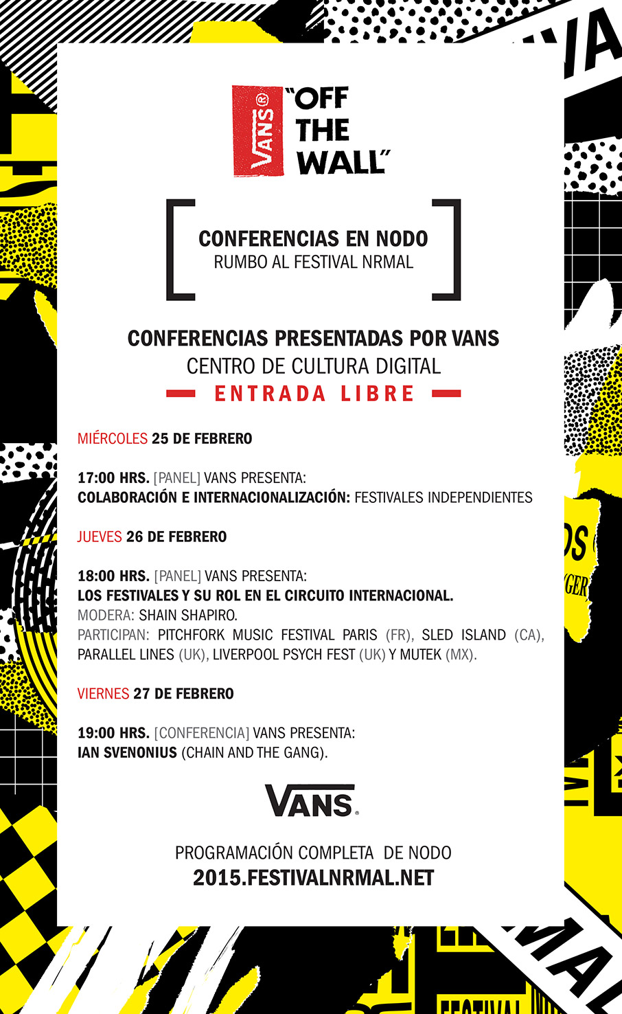 Como parte de las actividades del Festival NRMAL, Vans presentará tres conferencias con representantes y conocedores del medio musical, tanto a nivel nacional como internacional; esto en el marco de NODO, programa para el desarrollo, intercambio y coparticipación de agentes creativos y profesionales expertos en la materia.