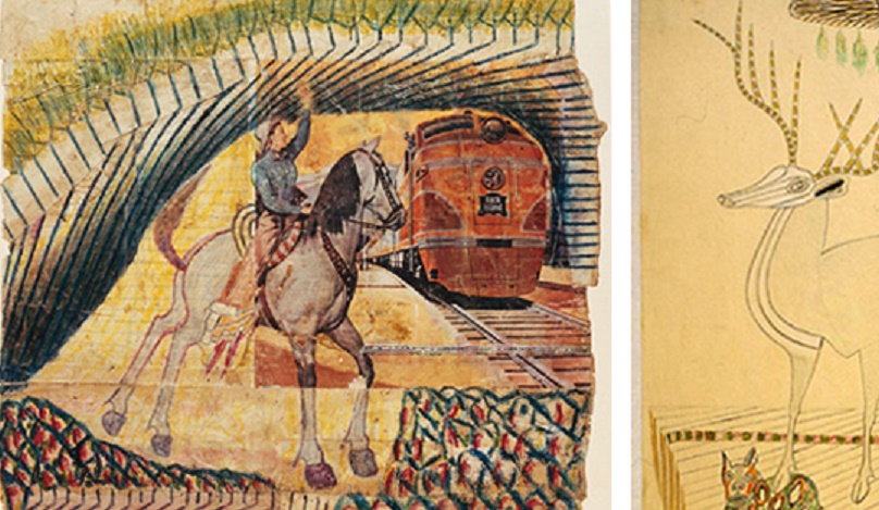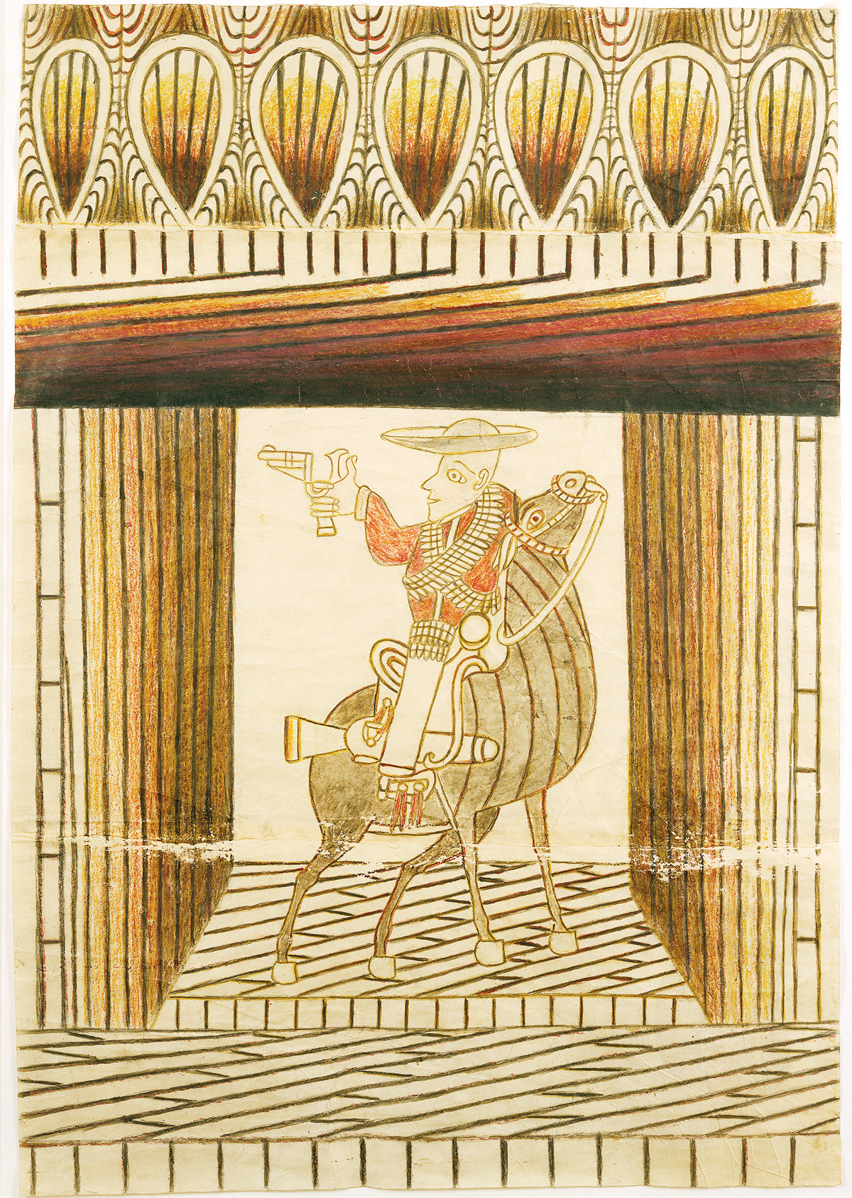En más de un lugar se ha comentado la visible contradicción que se establece entre lo rural de Jalisco y lo urbano de California en la obra de Martín Ramírez. Las figuras transitan de jinetes a conductores de autos, recorren carreteras y túneles interminables o se presentan inmóviles en escenarios, como si se mostraran ante un público que tuviera que imaginar en lo estático un trayecto. En varios casos, los pliegos en los que se desenvuelven estos dibujos, cuyo principal propósito pareciera ser el hacer visible la permanencia de un instante, fueron manufacturados por el mismo artista a partir de pedazos de cartoncillo y hojas que encontraba en pabellón en el que dormía. Son retazos de papel que alojaron las visiones de una mente fragmentada, los recuerdos que son observados confusamente desde la distancia temporal y la mirada misma, que lo llena todo con cientos de líneas.