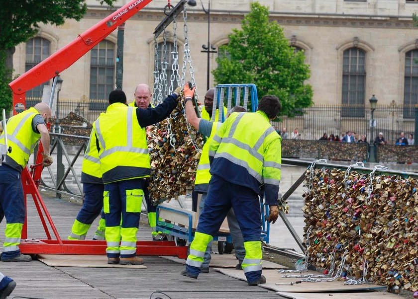 Tanto pesó la eternidad que en París tuvieron que quitarla. La ciudad lucirá algo desnuda después del pasado primero de junio, el día en que se decidió retirar los barandales del famoso Pont des Arts. Año tras año, sobre aquellas rejas, miles de amantes colgaban los candados que simbolizaban su eterna fidelidad. Eventualmente el cliché llegó a volverse peligroso: según la municipalidad de París, el estimado de 700,000 candados tentó con tirar la estructura.