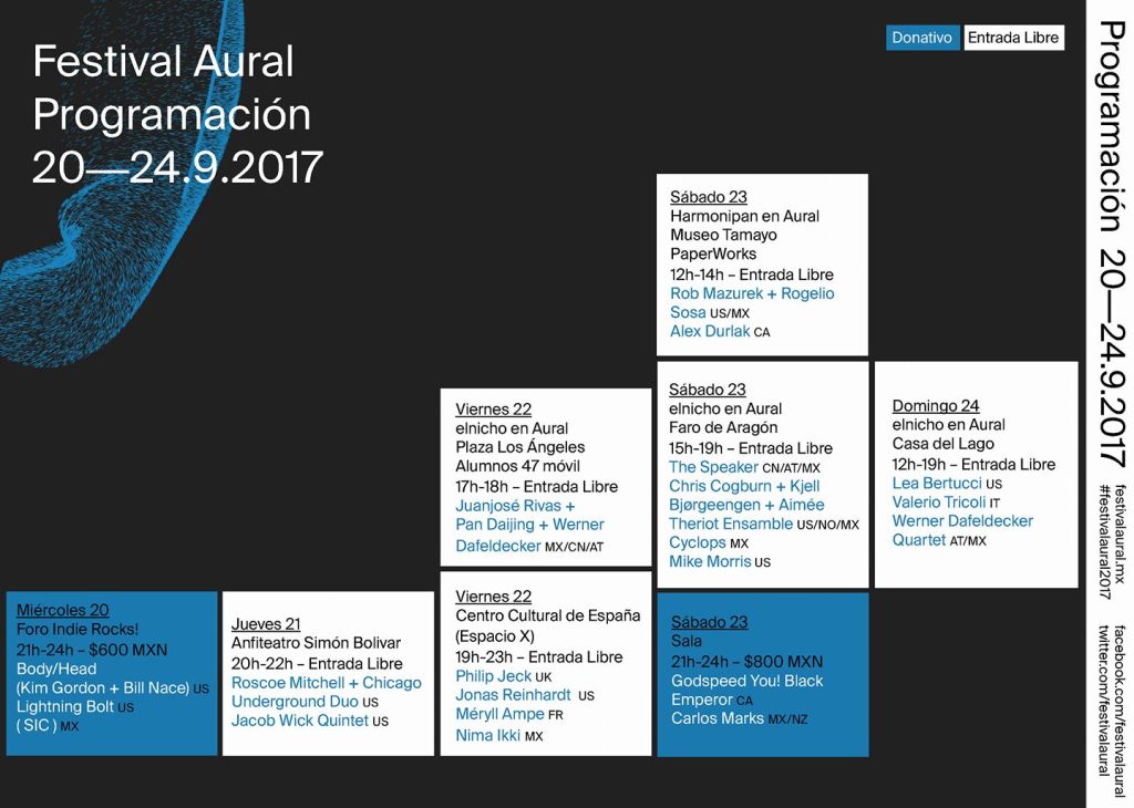 A partir de ahí se realizarán más de 21 actos en vivo en diversas sedes 20 al 24 de septiembre de 2017; la mayoría de los eventos serán gratuitos, pero si decides ir a los shows que tienen un precio por entrada, te recomendamos adquirir tu Pase Aural, el cual tiene un costo de 1,165 pesos, además de darte acceso preferencial y garantizado a todas las actividades.