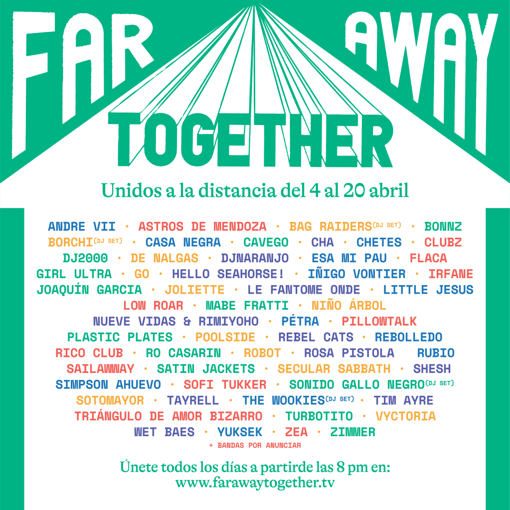 Far Away Together tiene una meta muy clara: ser una iniciativa que nos une a pesar de la distancia para disfrutar juntos lo que más nos gusta: la música. Para lograrlo, esta iniciativa ha reunido a diversos artistas nacionales e internacionales que brindarán shows vía streaming a través de www.farawaytogether.tv