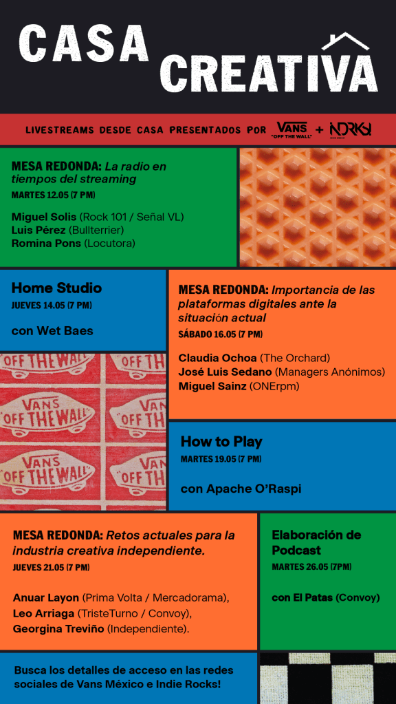 Desde nuestras casas hemos visto y escuchado diversos contenidos en línea para seguir disfrutando de la música, por lo que vale la pena hablar de esta experiencia. Para ello, Vans e Indie Rocks! dieron forma a Casa Creativa, un espacio para la conversación, creatividad y creación musical a través de mesas redondas y talleres virtuales.
