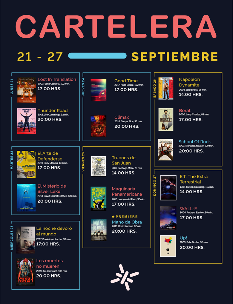 Entre los pilmes que se proyectarán se encuentran Lost In Traslation de Sofía Coppola (película que nos narra una historia de romance y tragedia); Climax de Gapas Noe (una historia donde el baile y desequilibrio mental son protagonistas; y Los Muertos no Mueren de Jim Jarmush (un filme de zombies con Bill Murray), entre otras películas.