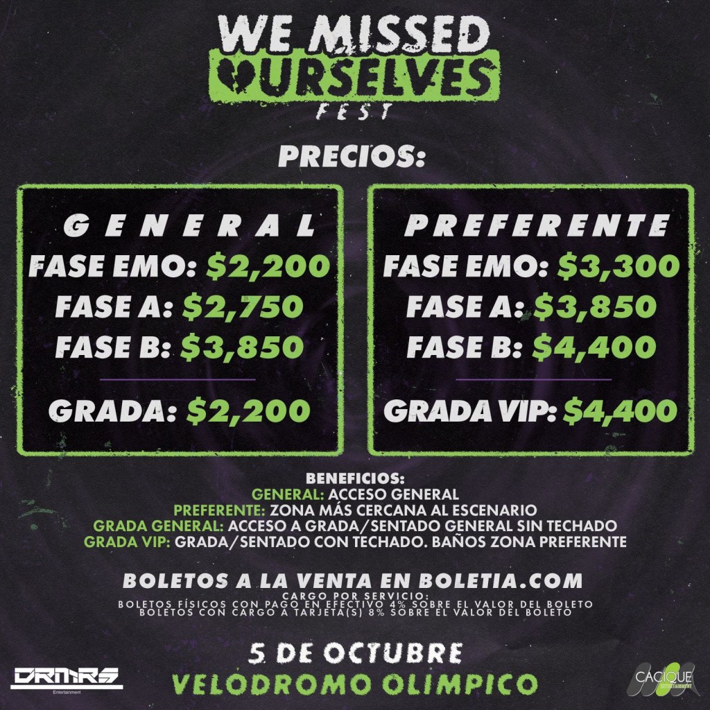 Para todos los fans de la melancolía, la nostalgia y la música de bandas como Falling in Reverse, les compartimos el cartel de We Missed Ourselves Fest, un evento que se realizará por primera vez en México apostando por ese género que dejó huella hace algunos años, pero que aún sigue viviendo en las nuevas generaciones.