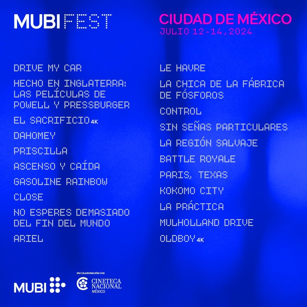 Conoce la lista completa de películas que se proyectarán en la edición 2024 del MUBI en la Ciudad de México. Recuerda estar atento a las redes del festival y de la Cineteca Nacional para adquirir tus boletos.