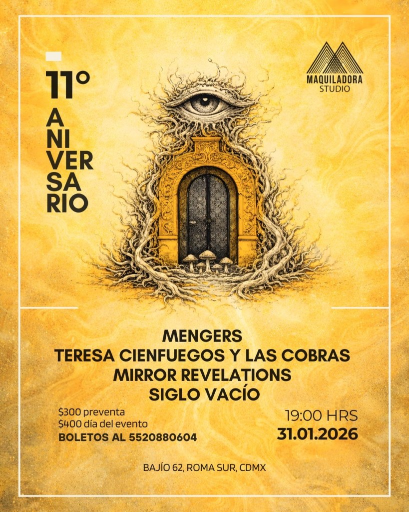 Para celebrar sus 11 años de vida, Maquiladora estudio realizará una fiesta llena de agrupaciones nacionales que forman parte de la escena independiente. La fecha es el próximo 31 de enero y será una gran noche para disfrutar del talento de Mangers, Teresa Cienfuegos y las Cobras, Siglo Vacío y Mirror Revelations.